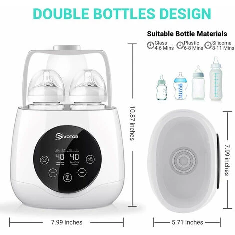 Funzionamento semplice: basta premere il pulsante per riscaldare il latte e nessun pulsante o impostazione complicata. Tutte le funzioni possono essere riservate.Design a doppio biberon: due biberon possono essere riscaldati contemporaneamente, ideale per nutrire i gemelli.Riscaldamento rapido ma uniforme: scalda il latte in modo uniforme per ridurre la perdita di nutrienti e il tuo bambino piange in tempo.Materiali di sicurezza: realizzati di materiale PP per uso alimentare, più amichevole e sicuro per i tuoi piccoli.Display a LED: la temperatura dell’acqua viene visualizzata sul display a LED e la durata della temperatura costante può essere regolata secondo necessità (si consigliano 0-2 ore).Protezione contro il surriscaldamento : Se l’acqua nel riscaldatore è secca o se la temperatura è troppo alta, si spegne automaticamente.