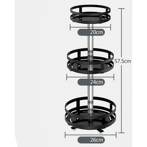 SPECIFICHE PRODOTTO:Marca: BakajiDimensioni: 26 x 26 x 57 cmMateriale: MetalloColore: NeroNecessita di montaggio: Si3 Ripiani capienti a cesto rotondoRipiani girevoli a 360°Molto versatile può essere impiegato negli ambiti più diversiDesign moderno e minimale Utile per conservare salse e spezieBase con ventose